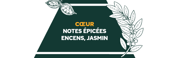 Le cœur révèle une profondeur fumée et spirituelle, où l’encens s’entrelace à la délicatesse du jasmin et à une brassée d’épices chaudes.